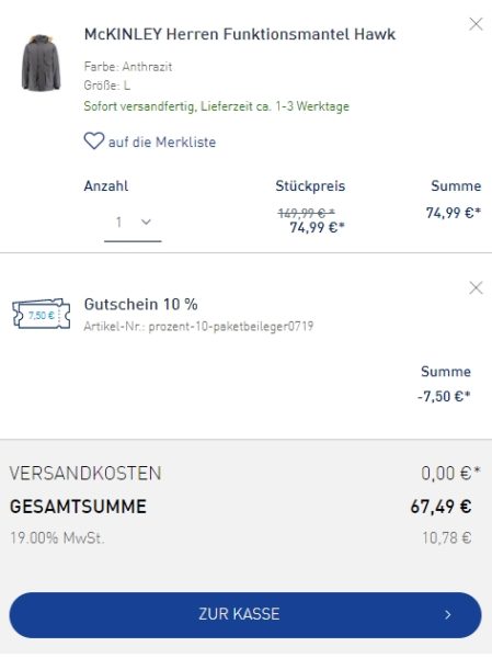 Denn bei Intersport bekommt man den McKINLEY Herren Fuktionsmantel Hawk (S-L, XXL) ab 67,49€ (Vergleichspreis: ~90€) Ersparnis ~23€.