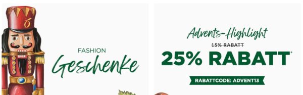 Matthi 13.12.2020, 08:55 #Neue Aktion: Ihr erhaltet mit dem Code ADVENT13 25% Rabatt auf Advents-Highlights aus Mode und Sport.