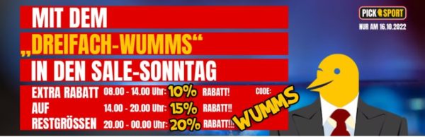 Bei PickSport erhaltet ihr nur heute bis zu 20% Rabatt auf Restgrößen in gestaffelter Höhe je nach Uhrzeit. 🙂