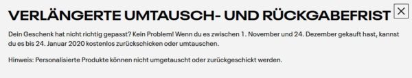 Tipp: Reebok bietet übrigens schon jetzt eine verlängerte Umtausch- und Rückgabefrist an. Somit kann bis 24 Januar 2020 kostenlos zurückgeschickt werden (bis auf personalisierte Produkte).