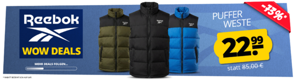 Perfekt für die anstehende Übergangszeit, bei SportSpar bekommt ihr die Reebok Heavyweight Puffer Herren Weste (verschiedene Farben) für 27,94€ (Vergleichspreis ~69€) Ersparnis ~41€