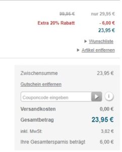 Um ich den Rabatt von 20% zu sichern, nutzt einfach den Gutscheincode SALE20 in eurem Warenkorb. Der Rabatt wird anschließend von allen berechtigten Artikeln abgezogen.