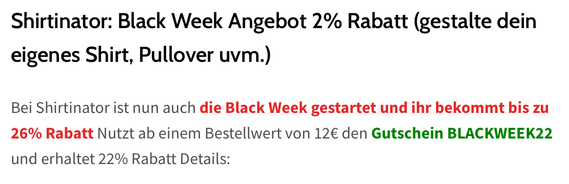 Shirtinator: Black Week Angebot 23% Rabatt (gestalte dein eigenes Shirt, Pullover uvm.)