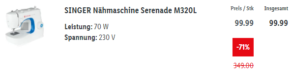 Denn bei LIDL bekommt man die Singer Serenade M320L Nähmaschine für 99,99€ (Vergleichspreis: ~150€) Ersparnis ~50€
