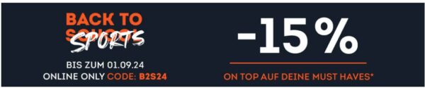 *Bedingungen: *Gilt nur für gekennzeichnete Artikel bis 01.09.2024 auf sportscheck.de (im Schritt „Prüfen und Bestellen“ Couponcode B2S24 angeben; Mindestbestellwert 25€). Ausgenommen Artikel mit Direktversand durch Partner. Nicht mit anderen Sonder- und Rabattaktionen kombinierbar. Keine Barauszahlung. Eine nachträgliche Gutschrift des Aktionsgutscheins auf eine abgeschlossene Bestellung ist nicht möglich. Nicht einlösbar in den SportScheck-Filialen, beim Kauf von Geschenkgutscheinen und bei Event-Anmeldungen.
