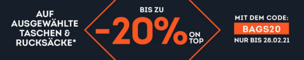 Matthi 27.02.2021, 17:22 # hilfreichBis zum 28.02.2021 bekommt ihr bis zu -20% on top auf ausgewählte Taschen & Rucksäcke. Nutzt dazu den Code BAGS20.
