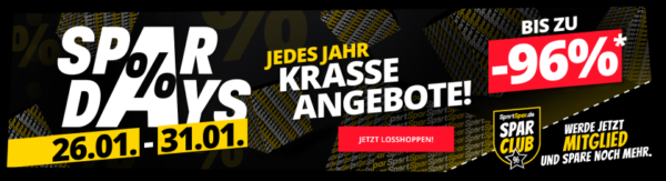 Bei SportSpar erhaltet ihr im Rahmen der „Spar Days“ nun bis einschließlich 31. Januar bis zu 96% auf ausgewählte Artikel des Sortiments. 🙂