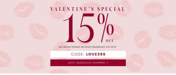 Bedingungen: Der Gutschein für den Sofortrabatt in Höhe von 15% ist ab einem Bestellwert von 39 € (Wert der nach einem etwaigen Widerruf behaltenen Ware) vom 14.02.2026 00:00 Uhr bis 15.02.2026 23:59 Uhr gültig. Die Rabatte sind nicht mit anderen Gutscheinen oder Aktionen (mit Ausnahme von Kaufgutscheinen) kombinierbar und gelten nicht beim Kauf eines Geschenkgutscheins. Eine Barauszahlung oder nachträgliche Anrechnung ist nicht möglich. Die Weitergabe und Veröffentlichung ist untersagt.