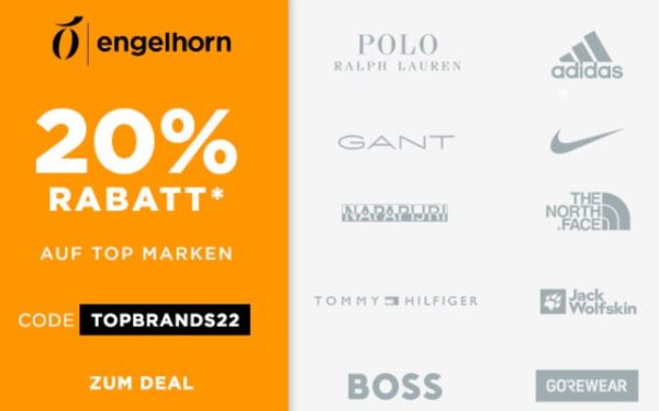 Bei Engelhorn gibt es auf die sogenannten Top Marken 20% Rabatt. Mit dabei sind viele Artikel von bspw. BOSS, Tommy Hilfiger, Calvin Klein uvm.