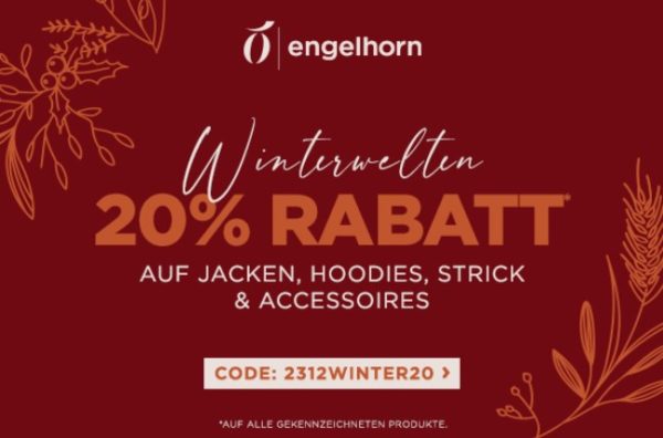 Bei Engelhorn erhaltet ihr bis einschließlich 04. Dezember 20% Rabatt auf Jacken, Hoodies Strick & Acc. 🙂