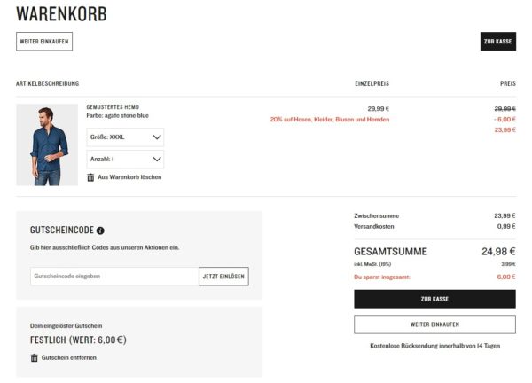 Der Gutschein kann auf die Kategorien Hosen, Kleider, Hemden, Blusen eingesetzt werden.