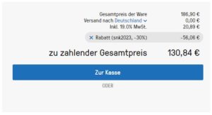 Die Versandkosten belaufen sich auf 3,99€, ab einem Bestellwert von 80€ entfallen diese.