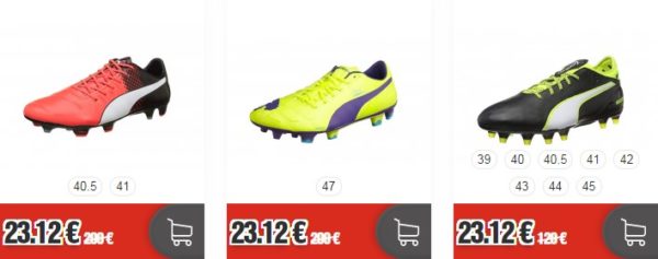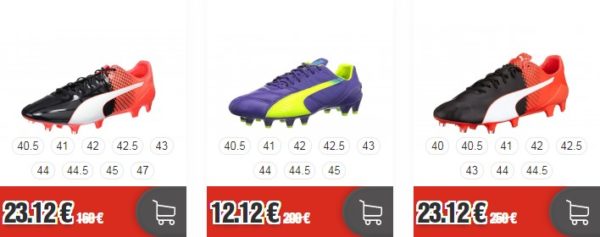 Im Onlineshop von Top12 erhaltet ihr gerade verschiedene PUMA Evo Fußballschuhe ab 12,12€. 🙂 Hinzu kommen hier leider Versandkosten in Höhe von 4,12€ welche allerdings aufgrund des geringen Preises für Markenfußballschuhe durchaus verscgmerzbar sind. 😉