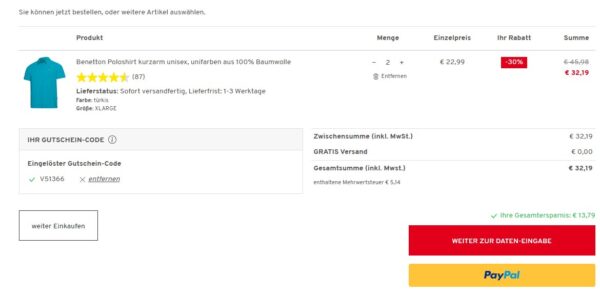 Dealcheck: Das ist mal eine Ansage! Ein originales Benetton-Polo für unter 17€ inklusive Versand ist eine absolute Seltenheit. Dank des aktuellen 30% Aktions-Rabatts, der bereits abgezogen ist, knackt ihr hier den Bestpreis für hochwertige Markenqualität. 👕