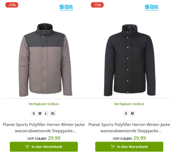 Die Jacken gibt es in 2 verschiedenen Farben und in verschiedenen Größen. Beachtet bitte dass es zwar noch einen 7% Newslettergutschein gibt, dieser aber einen MBW von 60€ hat.
