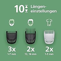 - Das Set enthält: 1x Philips All-in-One Trimmer 3000er-Serie, 1x Komfortklinge, 1x Nasentrimmer, 1x verstellbarer Kamm (3–7 mm), 2x Stoppelkämme (1 mm, 2 mm) und mehr