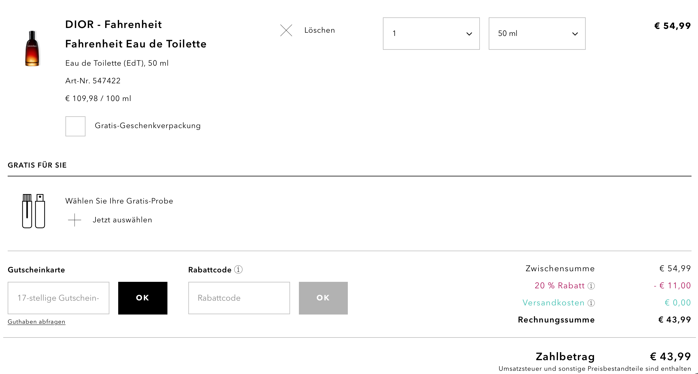 Matthi 21.02.2019, 19:06 # hilfreichIch bin mir nicht ganz sicher, ob Dior von der Aktion ausgeschlossen ist. Bei mir jedenfalls funktioniert der Rabattcode ?