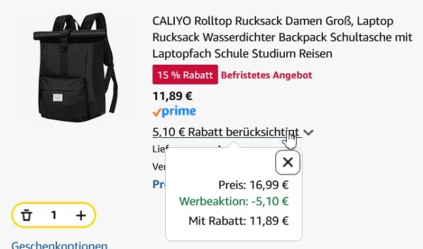 Bei Amazon gibt es dank einem Gutschein den CALIYO Rolltop Rucksack mit Laptopfach