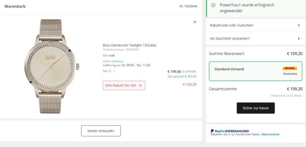 - Boss Damenuhr Twilight für 159,20€ (Vergleichspreis: ~199€) Ersparnis ~40€