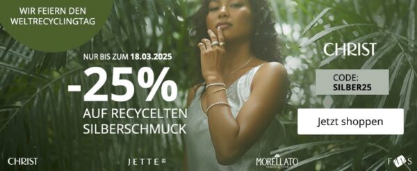 Bei CHRIST erhaltet ihr nun bis einschließlich 18. März satte 25% Rabatt auf recycelten Silberschmuck. 🙂
