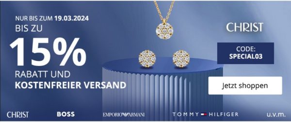 - 15 % Rabatt auf ausgewählte Artikel von Top-Marken, wie Diamant- und Goldschmuck von CHRIST, Accessoires von Michael Kors, Tommy Hilfiger und den weiteren dargestellten Marken.