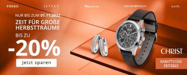 Bei Christ erhaltet ihr bis einschließlich 1. November bis zu 20% Rabatt auf Uhren & Schmuck.