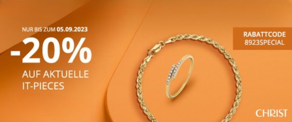 Du suchst gerade ein paar neue Accessoires? Vielleicht einen Ring, Ohrring oder eine Kette? Bei CHRIST gibt es bis einschließlich 5. September satte 20% Rabatt auf ausgewählte IT-Pieces! 🙂