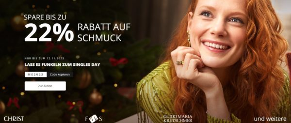 Auch bei Christ ist mittlerweile der Singles-Day gestartet 🥳, dort bekommt ihr bis zu 22% Rabatt auf ausgewählte Schmuckstücke.