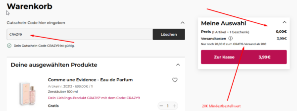 Ihr bekommt nämlich das erste Produkt GRATIS und müsst nur den MBW von 20€ erreichen. Ab 20€ wird zudem versandkostenfrei verschickt (ansonsten 3,99€ Versand)