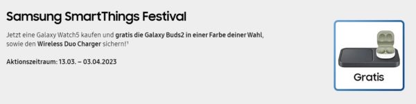 Schönes Angebot im Onlineshop von Samsung, dort bekommt ihr die Samsung Galaxy Watch 5 40mm BT + Galaxy Buds 2 + Wireless Charger Duo für 228,65€ (Vergleichspreis ~301€) Ersparnis ~72€