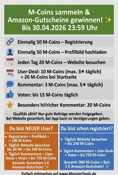 Dann registriert euch auf der Website http://www.MonsterDealz.de , ladet ein Profilbild hoch (=100 M-Coins) besucht bis zum 30.04.2026 täglich 1x die Website (bis zu 240 M-Coins) und schreibt dann noch jeden Tag ein paar Kommentare (bis zu 180 M-Coins möglich) und verfasst ein paar Userdeals (bis zu 360 M-Coins möglich) oder voted Deals (bis zu 180 M-Coins) dann habt ihr nach Gewinnspielende garantiert 5€ Amazon.de als Prämie 🙂