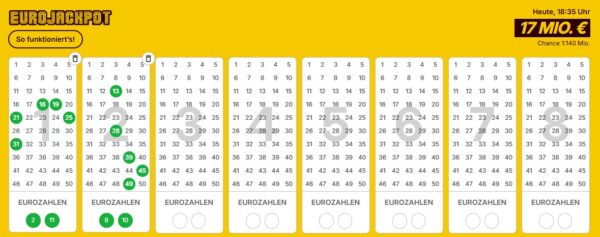 Um am EuroJackpot teilzunehmen, müssen Spieler fünf Hauptzahlen aus einem Bereich von 1 bis 50 sowie zwei Eurozahlen aus einem Bereich von 1 bis 10 auswählen. Die Ziehung findet einmal pro Woche statt, normalerweise freitags in Helsinki, Finnland. Die Gewinnchancen beim EuroJackpot sind im Vergleich zu anderen Lotterien relativ hoch, was zu einem stetigen Interesse an dieser Lotterie führt.