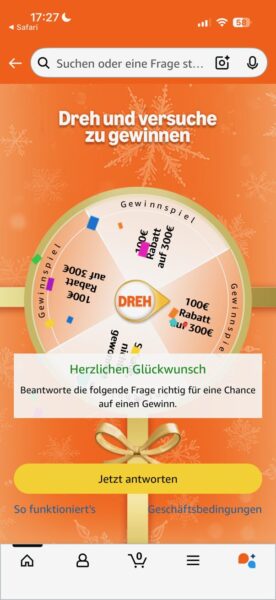 Mit etwas Glück kann man bei Amazon in der App beim Glücksrad mitmachen und dabei einen 100€ Rabatt (MBW 300€) gewinnen.