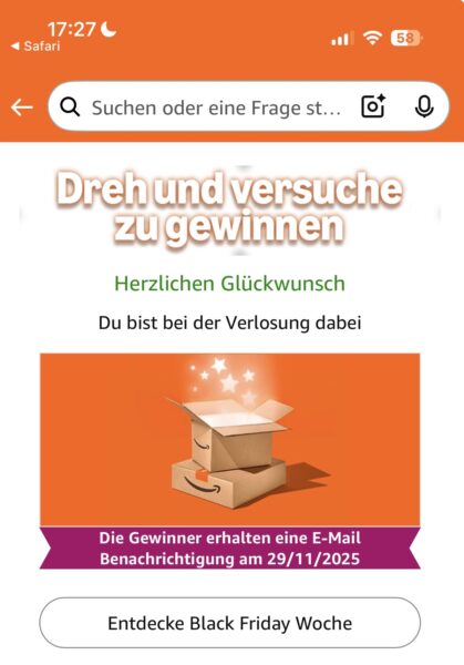 Die Frage lautetete wann endet der Black Fiday bei Amazon und die Antwort dazu war bei mir der 01.12.2025.