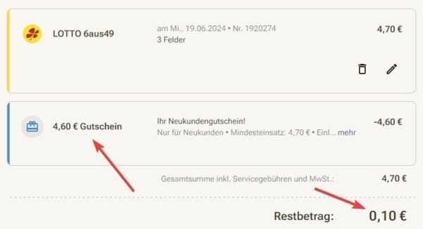 Wie wäre es mal wieder mit einem Glücks-Tipp? 🎟️ Bei LOTTO24 erhaltet ihr derzeit als Neukunde wieder 3 Felder LOTTO 6 aus 49 für 0,10€ (statt: 4,70€) Ersparnis 4,60€