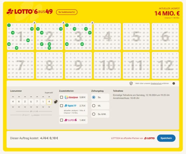*SUPER* LOTTO24: 3 Felder LOTTO 6 aus 49 für 0,10€ als Neukunde