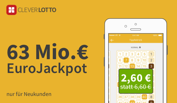 *NEUKUNDEN* CleverLotto 3 Felder Euro Jackpot (63 Mio.€) für nur 2,60€ (statt 6,60€)