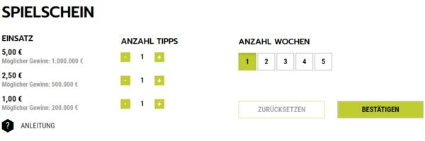 - Einsatz 5,00 €: Chance auf 1 Million €