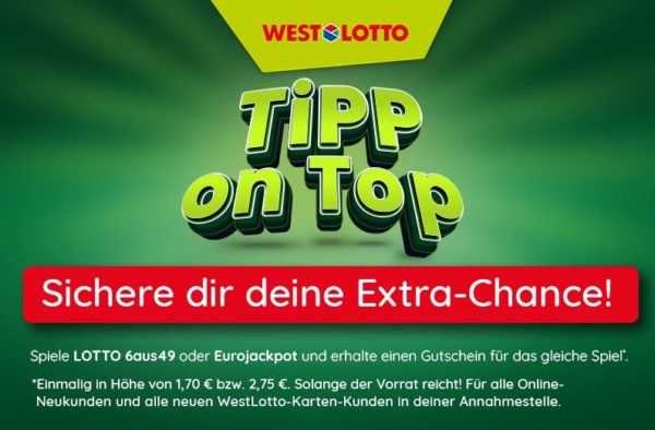 Bei WestlLotto gibt es bis einschließlich 05. Juni eine Neukundenaktion mit Tipp on Top