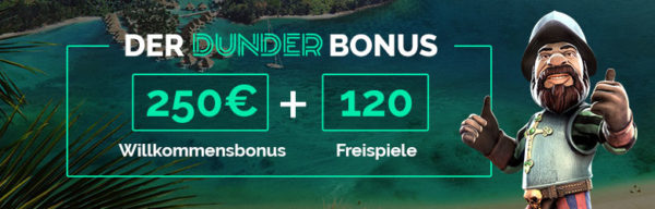 - Dunder: 100% Bonus bis 250€ + 120 Freispiele Book of Dead