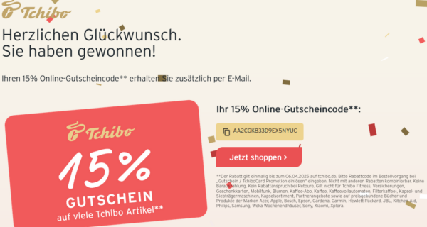 **Der Rabatt gilt einmalig bis zum 06.04.2025 auf tchibo.de. Bitte Rabattcode im Bestellvorgang bei „Gutschein / TchiboCard Promotion einlösen“ eingeben. Nicht mit anderen Rabatten kombinierbar. Keine Barauszahlung. Kein Rabattanspruch bei Retoure. Gilt nicht für Tchibo Fitness, Versicherungen, Geschenkkarten, Mobilfunk, Blumen, Kaffee-Abo, Kaffee, Kaffeevollautomaten, Filterkaffee-, Kapsel- und Siebträgermaschinen, Kapselsortiment, Partnerangebote sowie auf preisgebundene Bücher und Produkte der Marken Acer, Apple, Bosch, Epson, Gardena, Garmin, Hewlett Packard, JBL, Kitchen Aid, Philips, Samsung, Weka Wochenendhäuser, Sony, Xiaomi, Xplora.