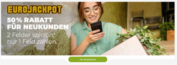 Dort gibt es 50% Rabatt für Neukunden beim Eurojackpot. Ihr könnt 2 Felder spielen und müsst nur 1 bezahlen.