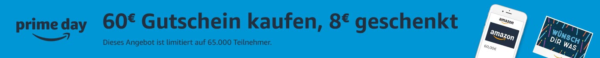 - Sie befinden sich unter den ersten 65.000 Prime-Kunden, die im Aktionszeitraum (21. Juni 0:00 Uhr bis 22. Juni 23.59 Uhr) einen digitalen Amazon.de Geschenkgutschein oder einen Amazon.de Geschenkgutschein zum Ausdrucken im Gesamtwert von mindestens 60€ gekauft haben.