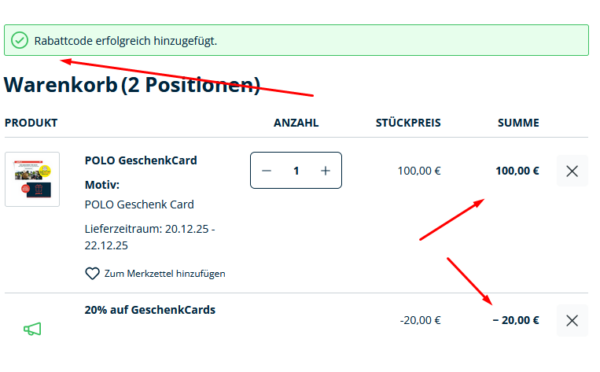 - Dieser Rabatt ist online bis zum 24.12.25, 14:00 Uhr gültig und wird nach Eingabe des Codes im Warenkorb abgezogen. Keine Barauszahlung. Der Kauf von GeschenkCards mit GeschenkCards ist ausgeschlossen. Nicht kombinierbar mit anderen Aktionen. Irrtümer und Änderungen vorbehalten. Es gelten die POLO-AGBs.