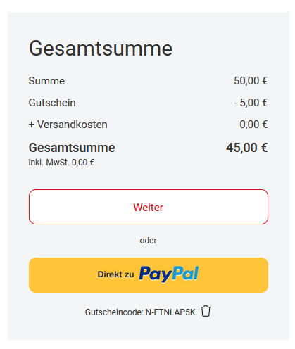 - Kauft euch einfach eine 50€ Gutscheingold Geschenkcode Karte für 50€ (hier gibt es noch weitere Karten) mit dem 5€ Newslettergutschein: N-FTNLAP5K
