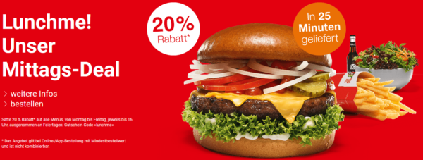 - *Das „Lunchme!“-Angebot gilt von Montag bis Freitag bis 16 Uhr in teilnehmenden Stores (Feiertage ausgenommen). Einlösbar bei Online-Bestellung über den burgerme-Webshop oder unsere App mit Mindestbestellwert und vor Abschluss des Bestellvorgangs. Nachträgliche Verrechnung ist nicht möglich. Nicht kombinierbar mit weiteren Rabatten oder Gutscheinen.