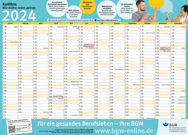 Zur Urlaubsplanung oder für die Gestaltung des Dienstplans: Mit dem BGW-Plakatkalender behaltet ihr das Jahr im Blick. Das Jahreskalendarium wird ergänzt durch Tipps zum Umgang mit Konflikten.