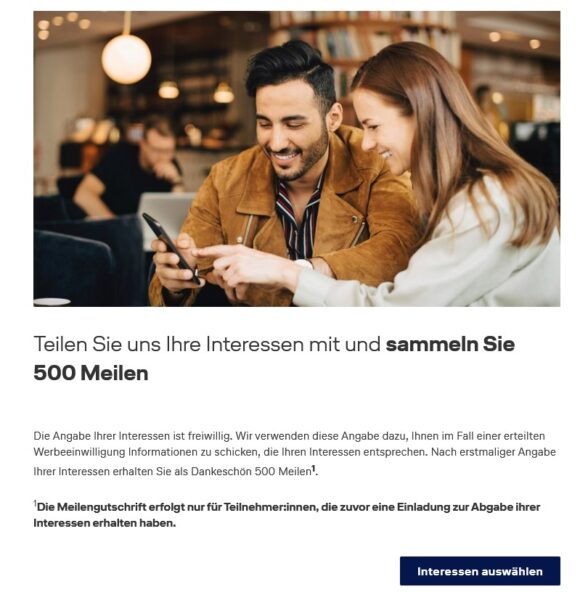 Wählt einfach 3 Interessen-Gebiete aus und bekommt die 500 Meilen gutgeschrieben.