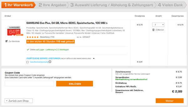 Das muss ein Fehler sein! Bei Saturn gibt es dank 9,75€ Direktabzug die SAMSUNG Evo Plus Micro-SDXC Speicherkarte, 64 GB, 100 MB/s für effektiv 0€ + 2,99€ Versand (alternativ Marktabholung kostenlos) (Vergleichspreis: ~13,64€) Ersparnis ~11€