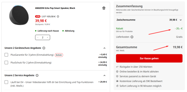 Dort gibt es dank einem 20€ Rabatt 2 Echo Pop Smart Speaker für nur 19,98€ (kostenlose Abholung, oder 4,99€ Versand) (Vergleichspreis: 2x,19,99€ zum Black Friday, eher sogar 2×34,99€ (regulärer Preis) Ersparnis bis zu ~50€